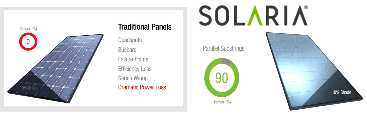 - For starters, Solaria® has a patented one of a kind technology enabling solar cells to be “shingled” together instead of connected with traditional bussing ribbons instead of electrical wires on the back or worst wires on the front. Why is that important? Because this prevents unnecessary shading of the PV cell, maintains optimization of power, and this specific technology ensures the most connectivity and durability under extreme weather conditions.